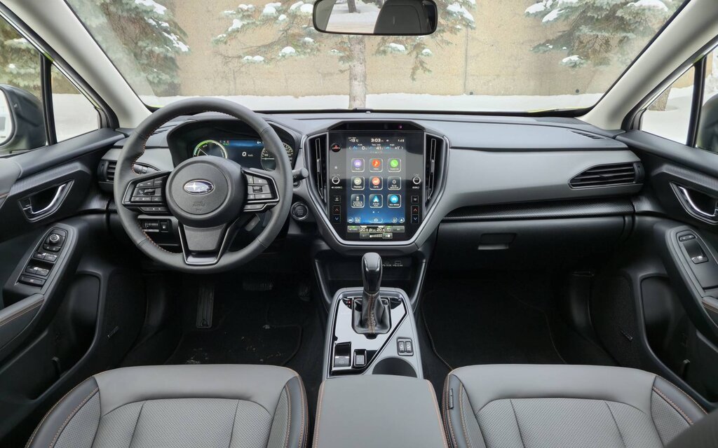While the extra weight of 142 kg (313 lbs) compared to the Limited model is somewhat noticeable, it doesn’t overly affect handling and braking performance. After freezing rain that transformed a vast, empty lot into an ice rink, we had some fun throwing the Crosstrek Hybrid sideways. Not to be disrupted, it remained easy to control and inspired confidence behind the wheel.
