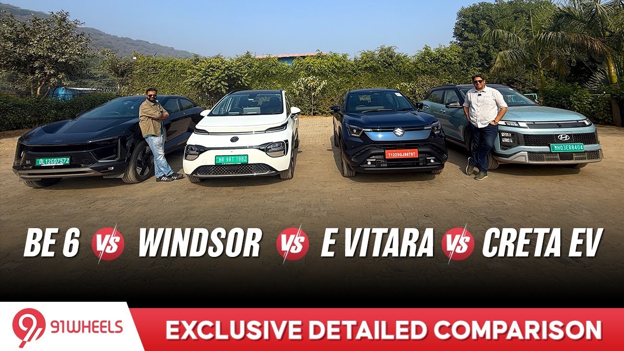 In this exclusive four car comparison, Bunny Punia and Shipranshu Pandey pit the new Maruti Suzuki e Vitara against some of its rivals. The four EV comparo includes design, space, specs and more. See how the new e Vitara stakes up against the Hyundai Creta electric, MG Windsor and the Mahindra BE 6.