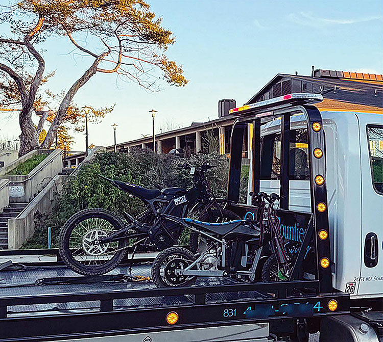 A motor officer patrolling Soquel Drive observed two electric motorcycles and initiated a traffic stop. Police said both riders were minors, unlicensed, and operating motorcycles that were not registered and had no proof of insurance. The children were released to their parents, and both motorcycles were towed.