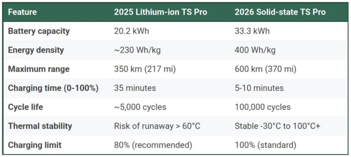 The removal of the 80% charging cap — a requirement for preserving the health of liquid electrolytes — enables users to utilise the full capacity of the battery without increasing the rate of degradation.