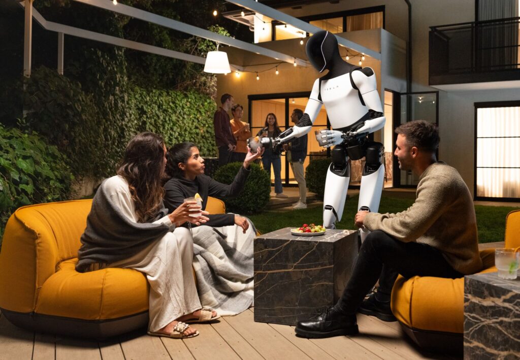 In this image provided by Tesla, an Optimus humanoid robot is seen serving at a party. “It’s an incredibly capable robot,” CEO Elon Musk promised investors this week. Later, he said the next-generation Optimus 4 will be built at Gigafactory Texas near Austin.