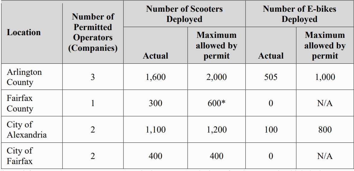 Fairfax County has one permitted operator, which is allowed to operate e-scooters only.