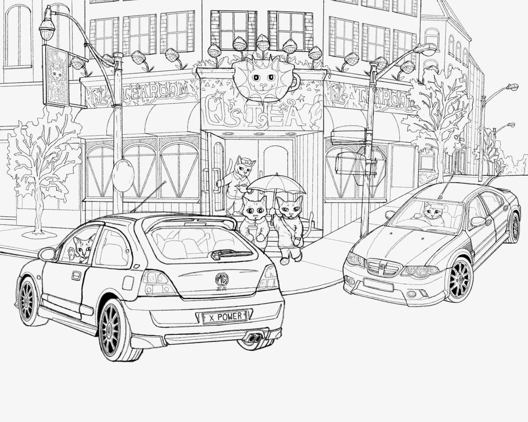 Drew some of my favourite MG hot hatches ZR and ZS in my world building artwork of Feli-city. Also I have been having aesthetic nostalgia for Global Village Coffeehouse.