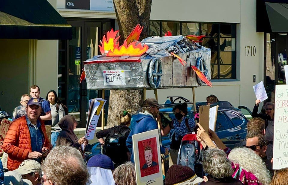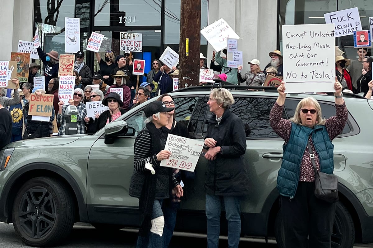 The March 1, 2025, “Tesla Takedown” protest on Fourth Street in Berkeley. Sally Francis