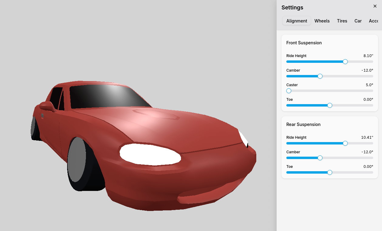 I've been developing a website in my spare time over the last couple years that lets users test any wheel, tire, and suspension specs and view what that looks like on a car in a real-time 3D environment