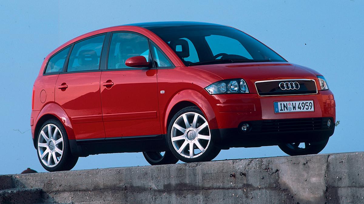 MEB Platform And Shared TechnologyA gray Audi A2 with small aerodynamic hubcaps, front 3/4 view