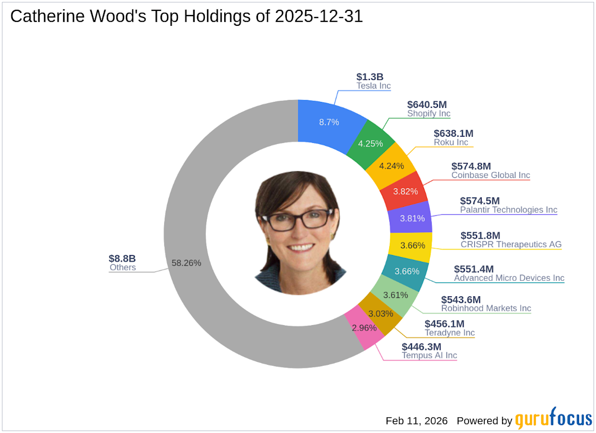 At the fourth quarter of 2025, Catherine Wood (Trades, Portfolio)’s portfolio included 196 stocks, with top holdings including 8.7% in Tesla Inc (NASDAQ:TSLA), 4.25% in Shopify Inc (NASDAQ:SHOP), 4.24% in Roku Inc (NASDAQ:ROKU), 3.82% in Coinbase Global Inc (NASDAQ:COIN), and 3.81% in Palantir Technologies Inc (NASDAQ:PLTR).