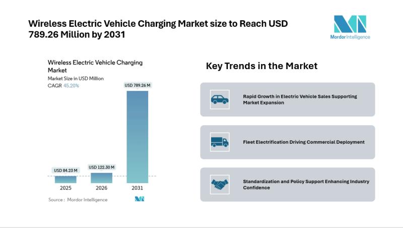 According to Mordor Intelligence, the wireless electric vehicle charging market is projected at USD 122.3 million in 2026 and reach USD 789.26 million by 2031, registering a CAGR of 45.2% during the forecast period. This wireless electric vehicle charging market forecast reflects the transition from pilot deployments to structured commercial rollouts across residential, fleet, and public infrastructure applications.