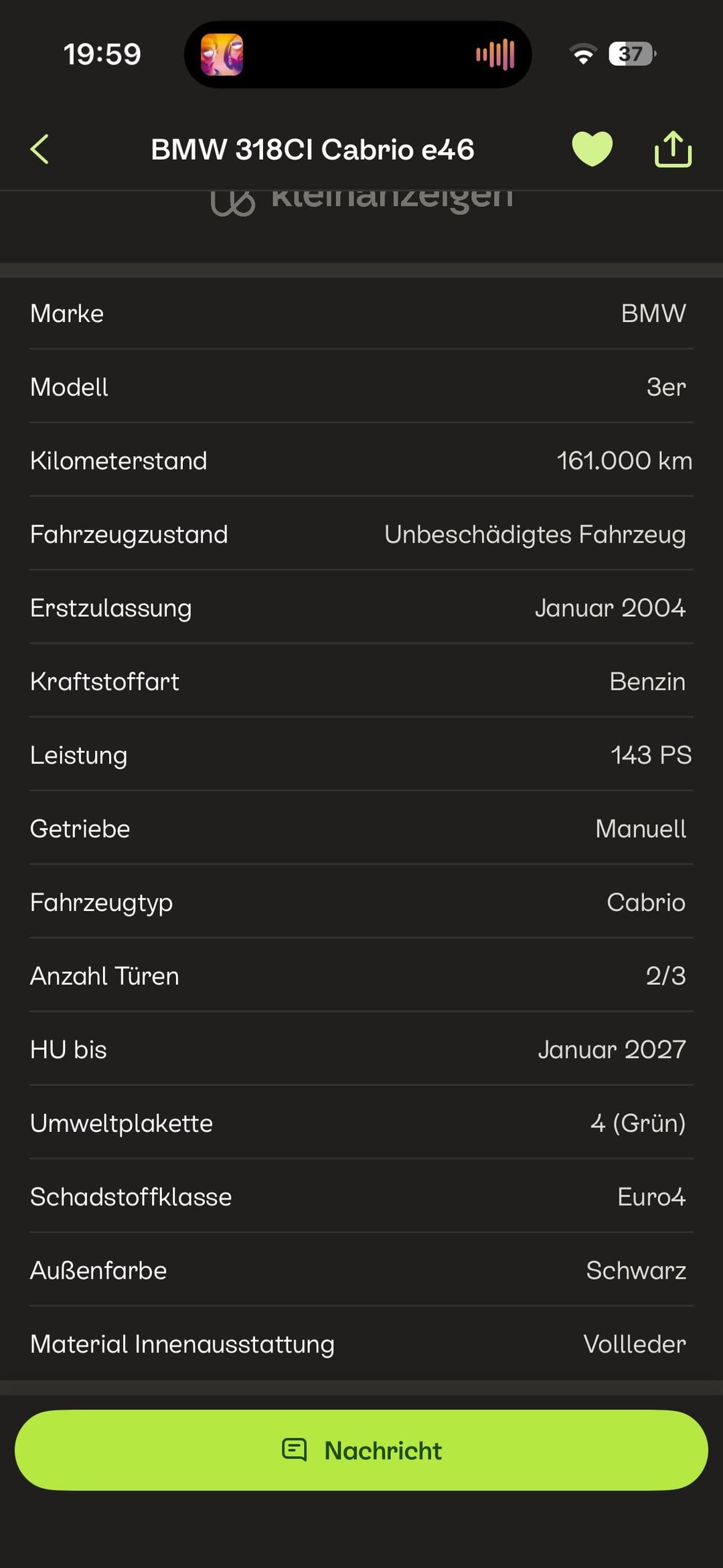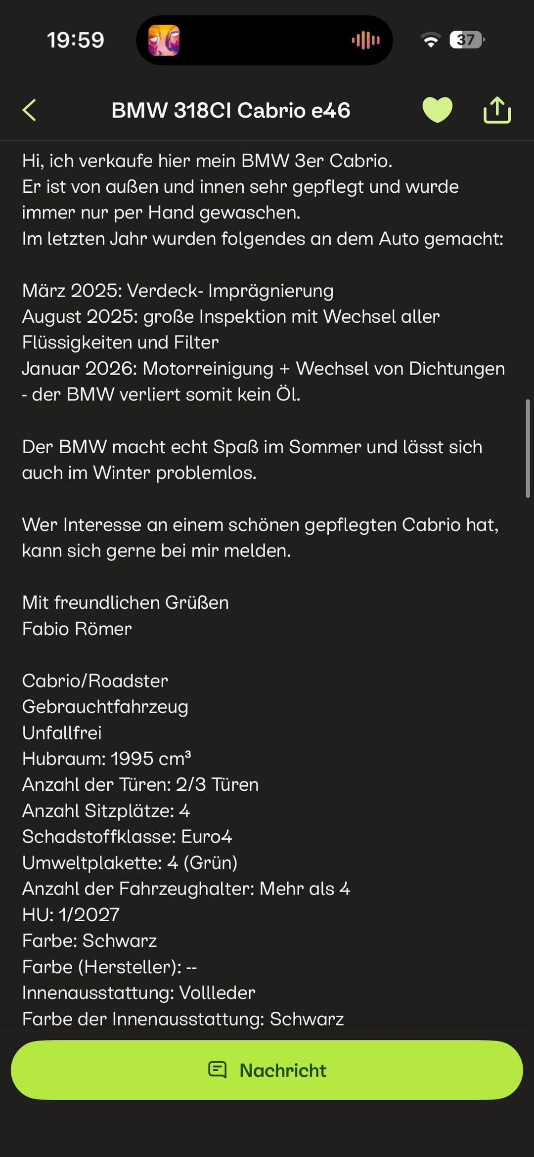Ich habe den e46 schon besichtigt und für sein Alter+Kilometer steht der super da, speziell die Sitze sehen auch noch top aus.