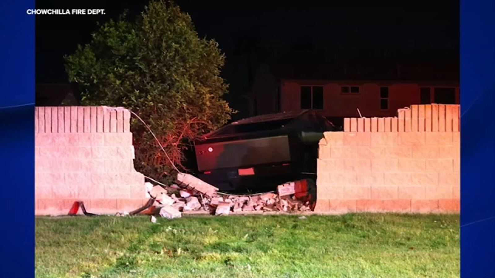 Officers and firefighters arrived to find this Tesla Cyber Truck crashed into a brick wall at the “Greenhills East Gate” off Robertson Boulevard and Gateway.