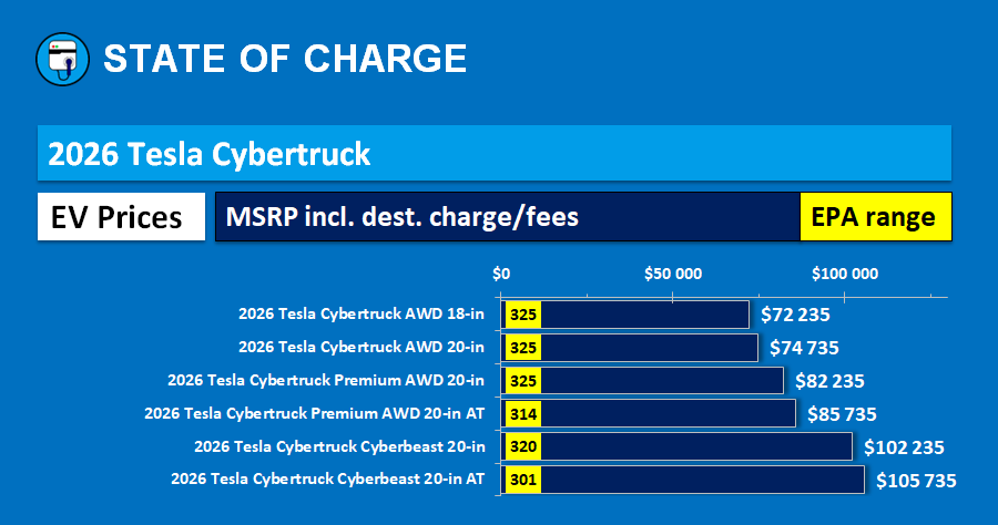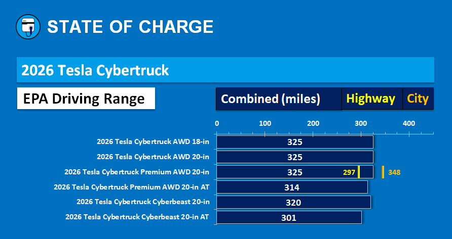 2026 Tesla Cybertruck: Prices and EPA range — March 3, 2026. (Image credit: State Of Charge)