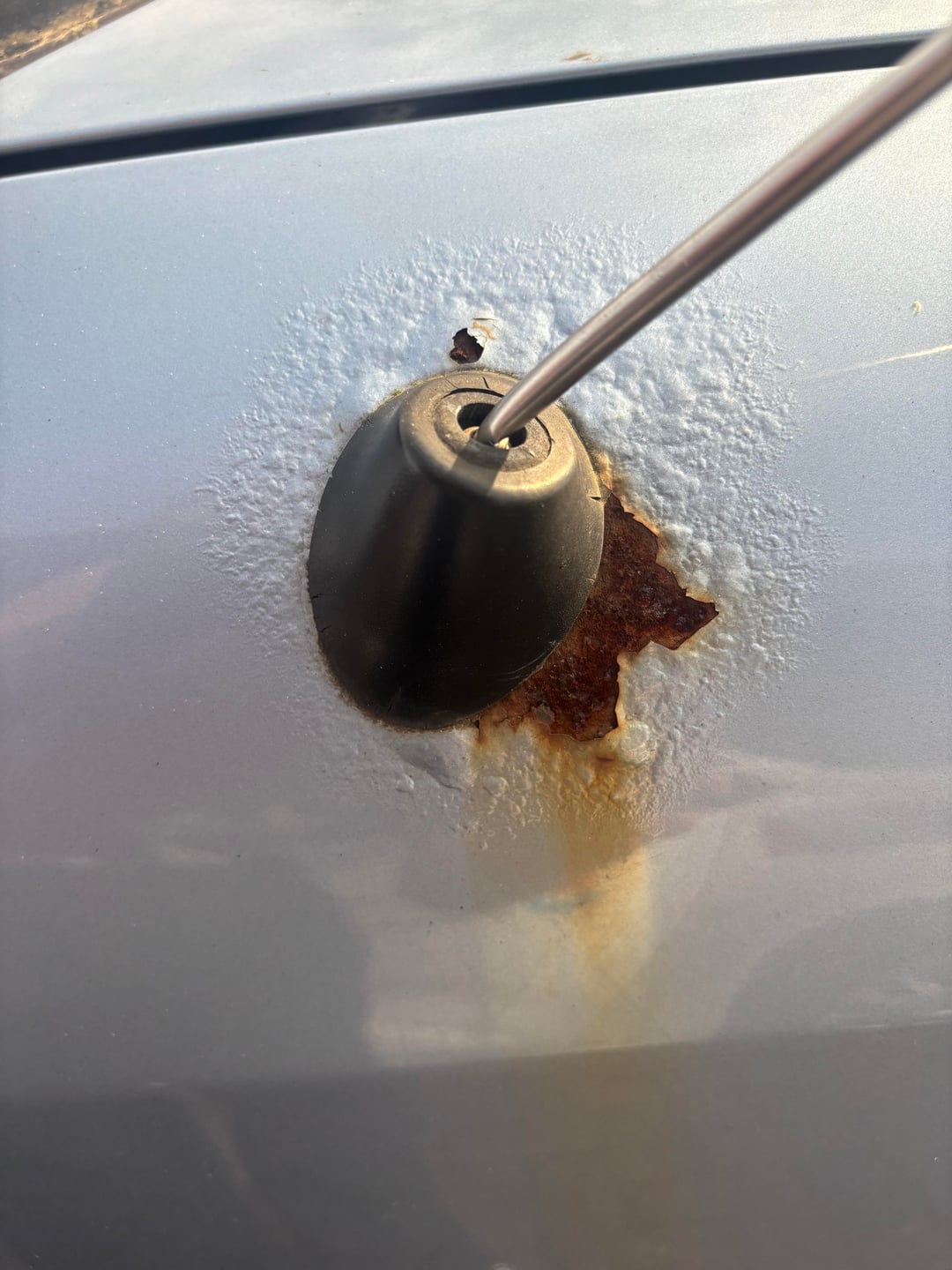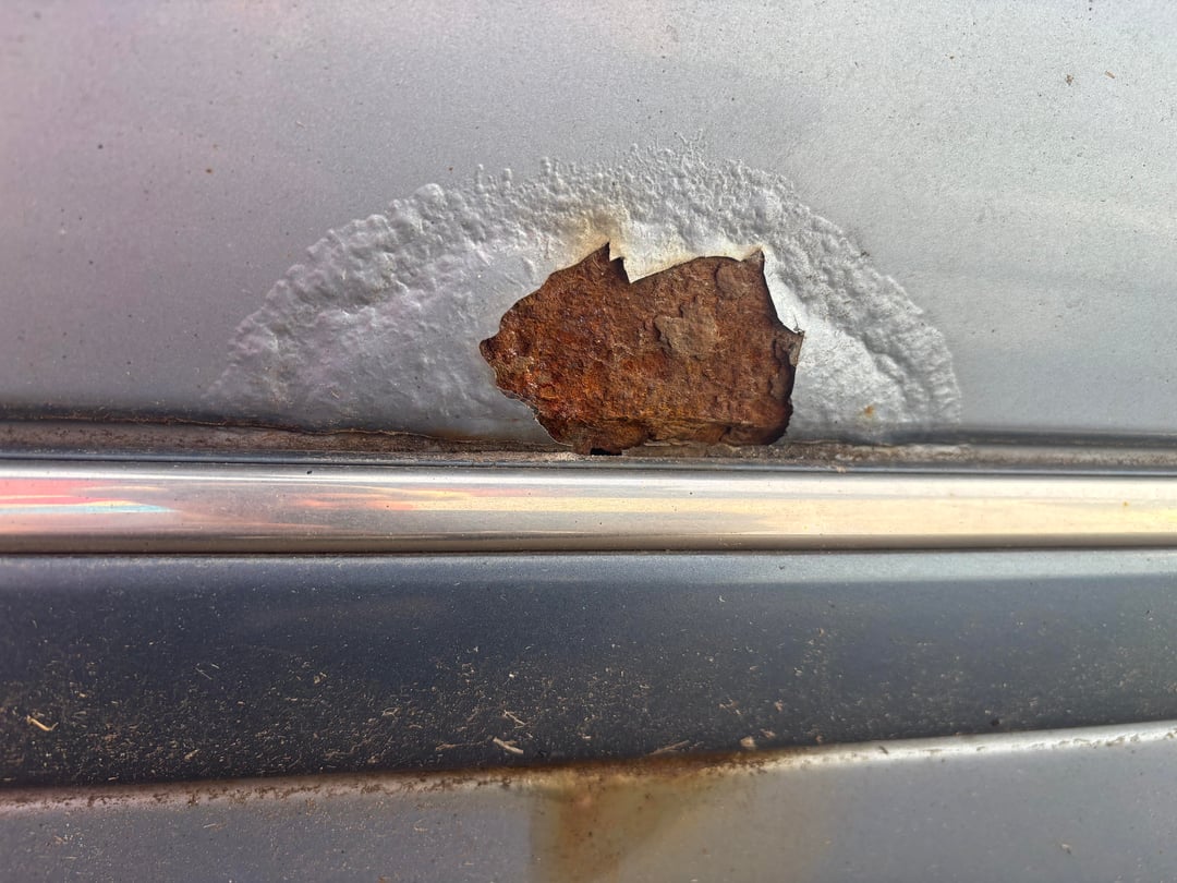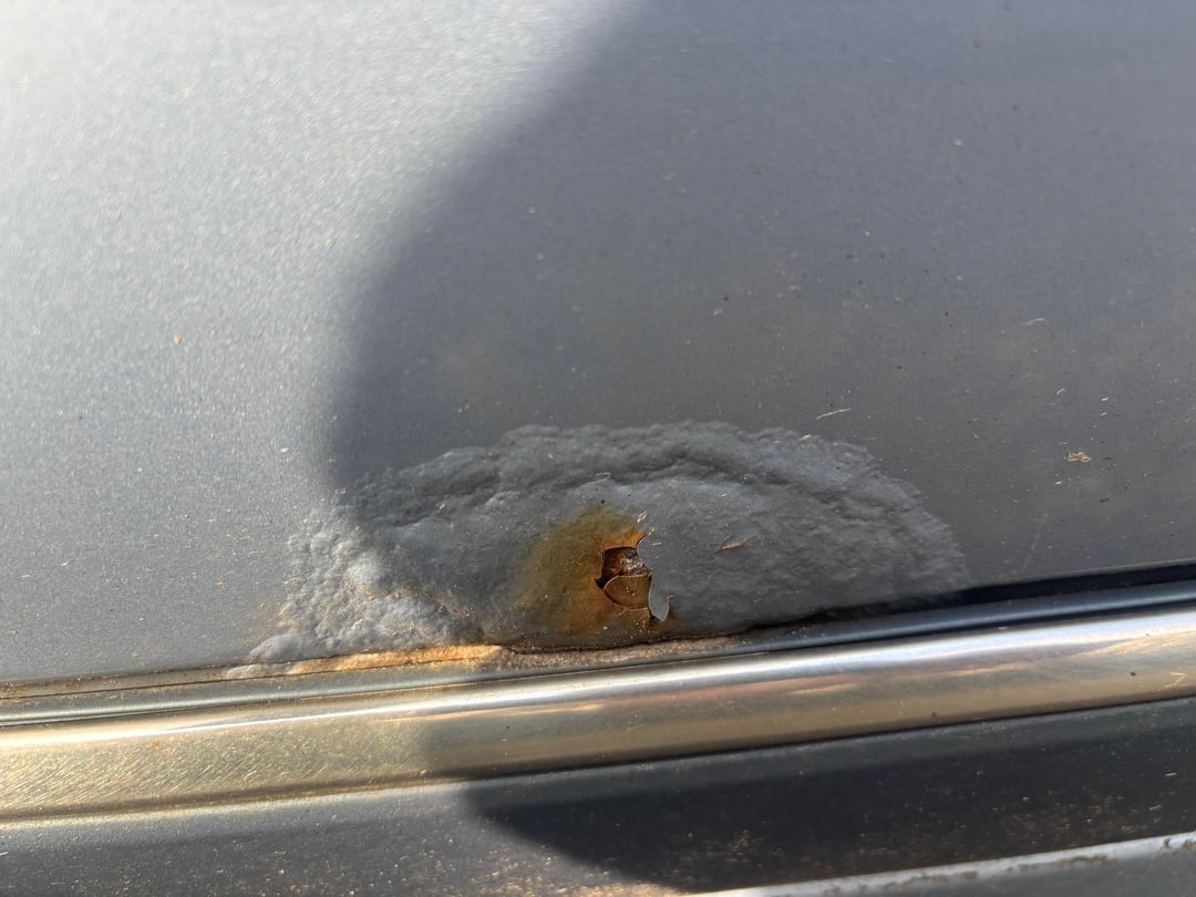– eine Stelle, wo der Lack stark aufgequollen ist und das Blech wohl schon angegriffen ist
