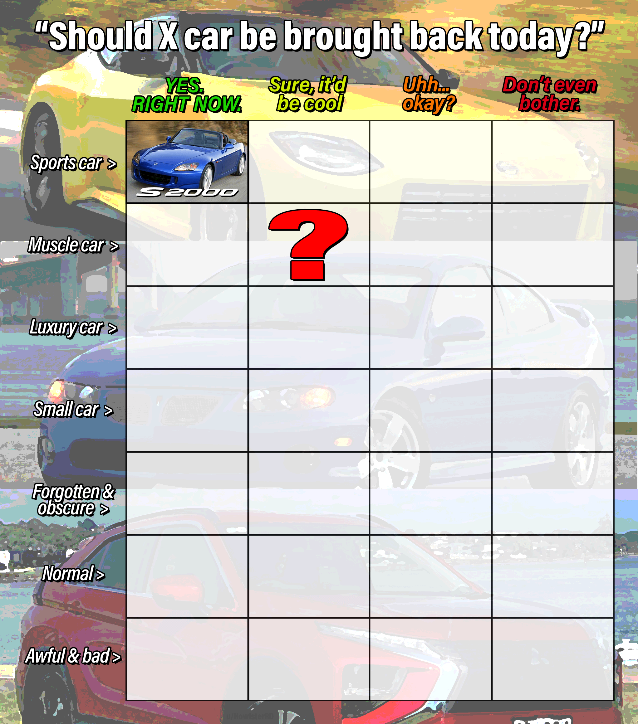 NOTE: Cars from dead brands are allowed! (just be creative in reviving them)