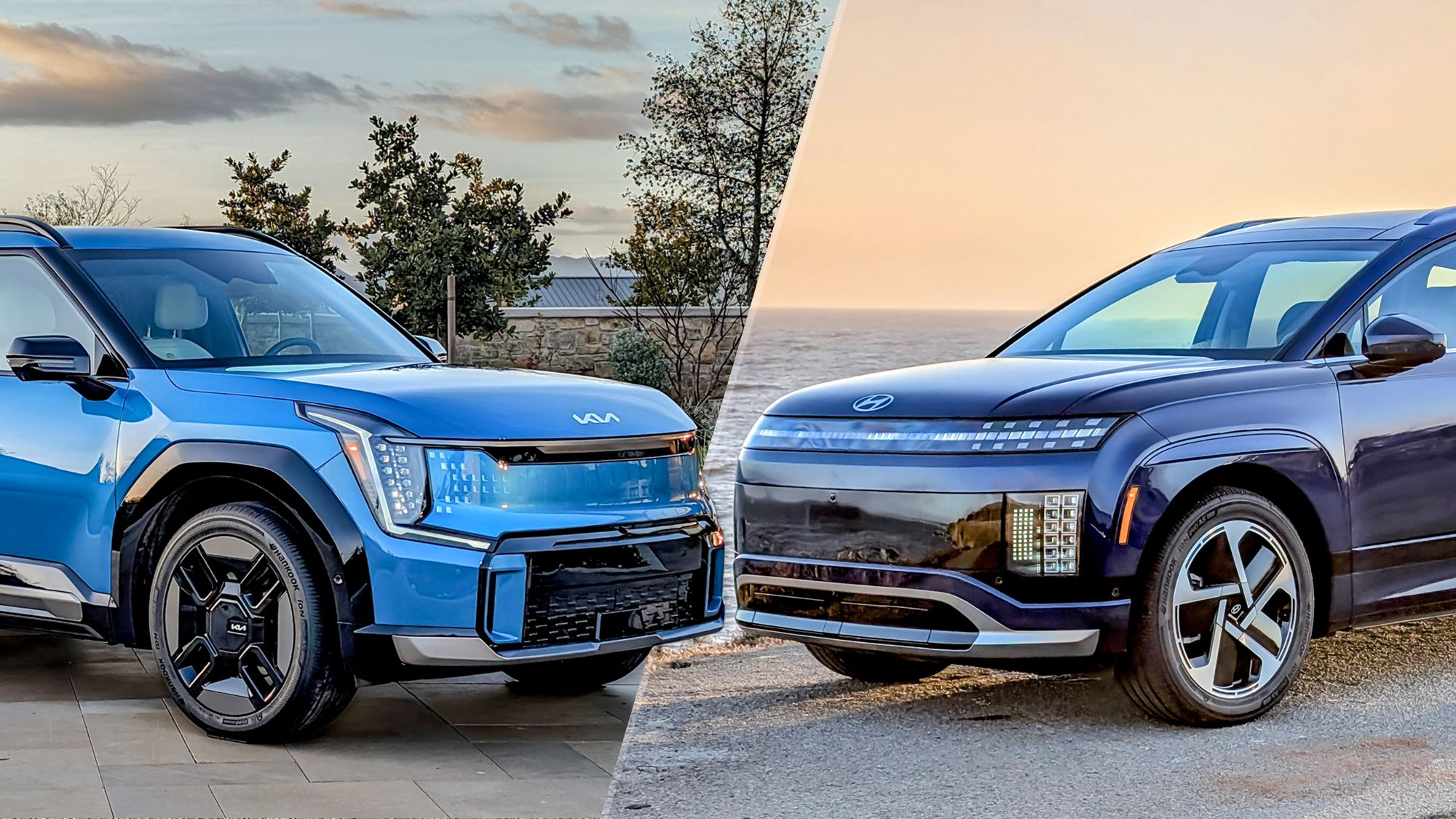 In this comparison, I’m taking a look at the Kia EV9 ($54,900+) and Hyundai IONIQ 9 ($58,955+), two three-row electric SUVs built on Hyundai Motor Group’s E-GMP (Electric Global Modular Platform). This EV platform, which is also used in popular EVs like the Kia EV6 and Hyundai IONIQ 5, uses a fast-charging 800V architecture and typically offers a range of 250 to 300 miles. E-GMP vehicles also share ADAS (Advanced Driver Assistance System) and infotainment tech.