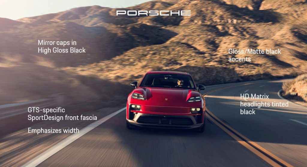 The exterior gains some slight changes like black-tinted headlights and more aggressive lower fascia, rear fascia that looks more like a diffuser (but likely offers little aero benefit), and side blades near the 21-22″ rear wheels (20″ not available on GTS). It also has black mirror caps and a different surface finish on exposed plastic parts.