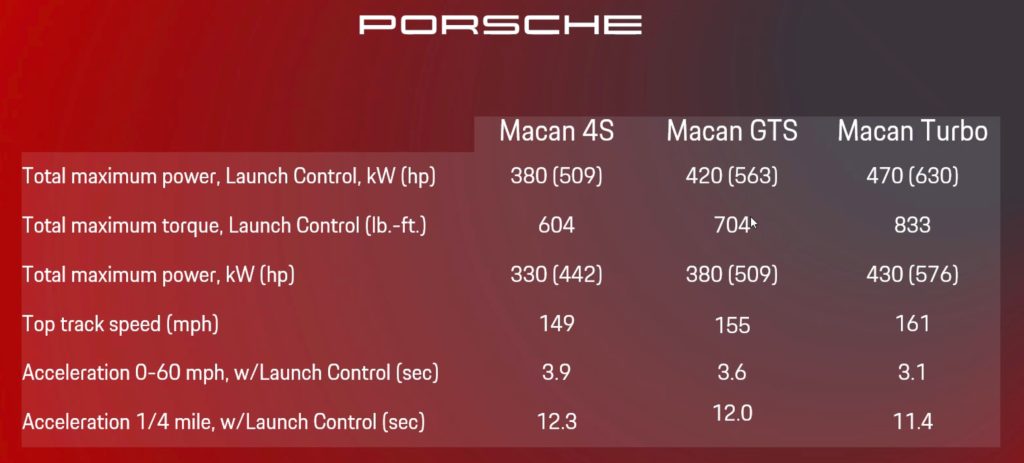 The Macan GTS is almost exactly in the middle of the 4S and Turbo in terms of powertrain performance. All three have a “launch control” mode which gives maximum power, and a base mode for normal operation. In each mode, the GTS is right inbetween the two previous specs.