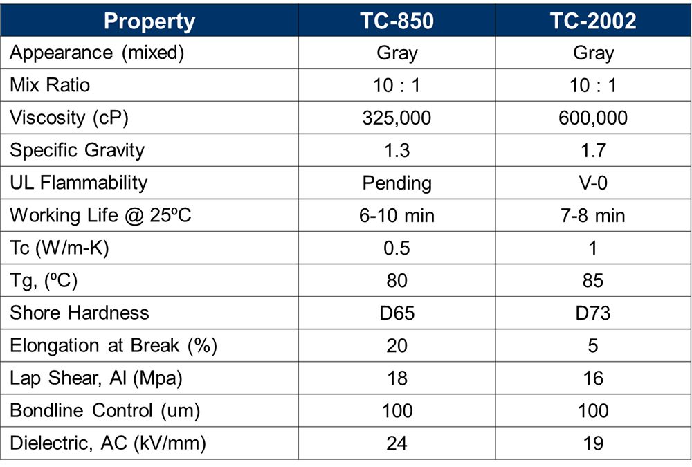 A key to the advancement of high energy-density, lithium-ion, battery packs is effective management of heat generated during charge and discharge cycles. Heat is often managed by connecting battery cells and/or modules to a cooling plate or pack via thermally conductive materials (gap fillers or adhesives). Typically, they are two-component polymeric resins with ceramic fillers. These promote heat conduction by displacing air from not only microscopic surfaces but large gaps as well.