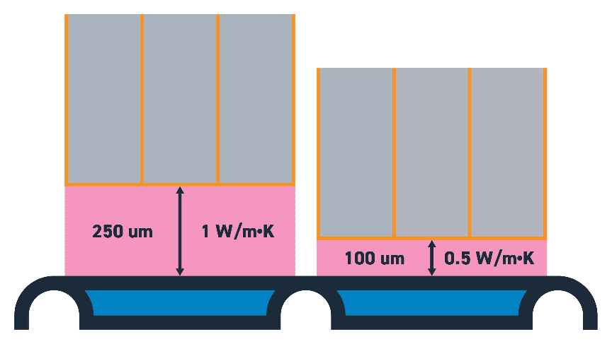 See below for an illustration demonstrating that a 0.5 W/m∙K with a 100um bondline achieves lower thermal resistance compared to a 1 W/m∙K material with a 250um bondline.