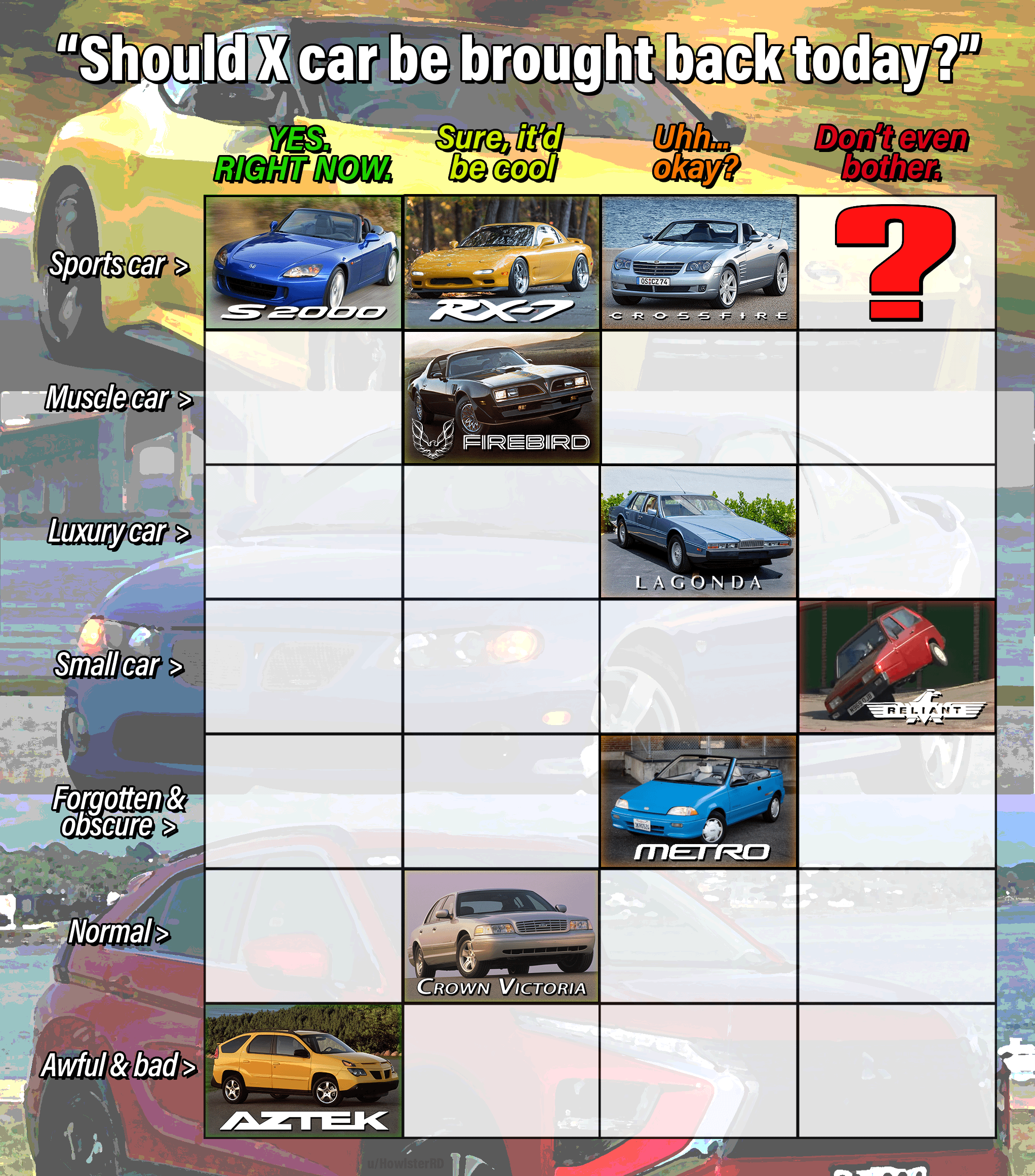 - Just be realistic and make sure the car actually fits within the given category.