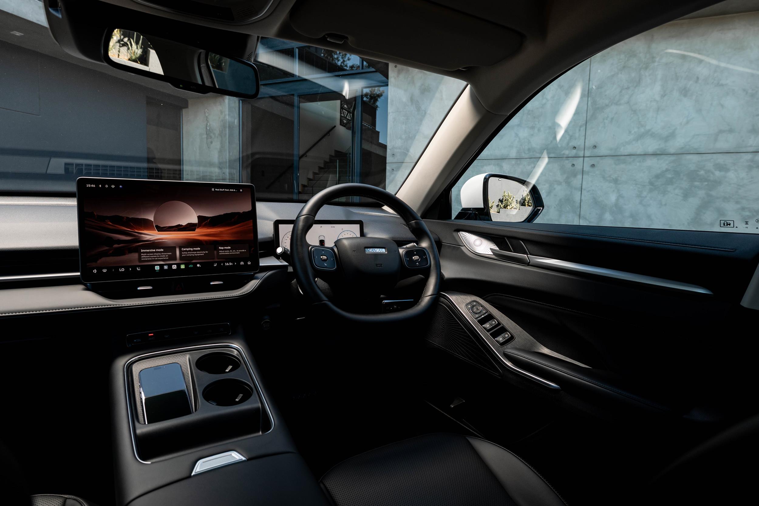 The cabin features GWM’s Coffee OS infotainment system with a 10.25-inch digital instrument cluster and a 14.6-inch central touchscreen. Wireless Apple CarPlay, Android Auto, Bluetooth, and a nine-speaker audio system are standard. Comfort equipment includes heated and ventilated front seats, heated steering wheel, dual-zone climate control, ambient lighting, and rear seats with armrest and cup holders.
