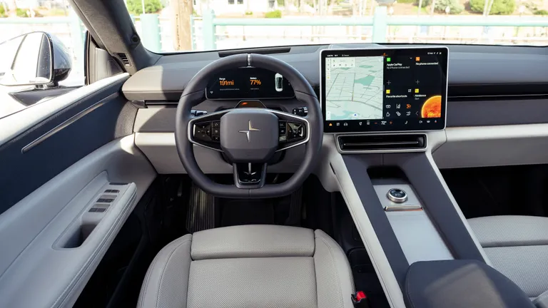 The 4’s arsenal of standard tech is expansive. The 10.2-inch driver display is smaller than what you’ll find on other luxury SUVs, but then again Tesla only equips a single display in its vehicles. In the Polestar 4, you also get an enormous horizontally oriented 15.4-inch infotainment touchscreen with standard wireless Apple CarPlay (no Android Auto) and Google Built-In applications.