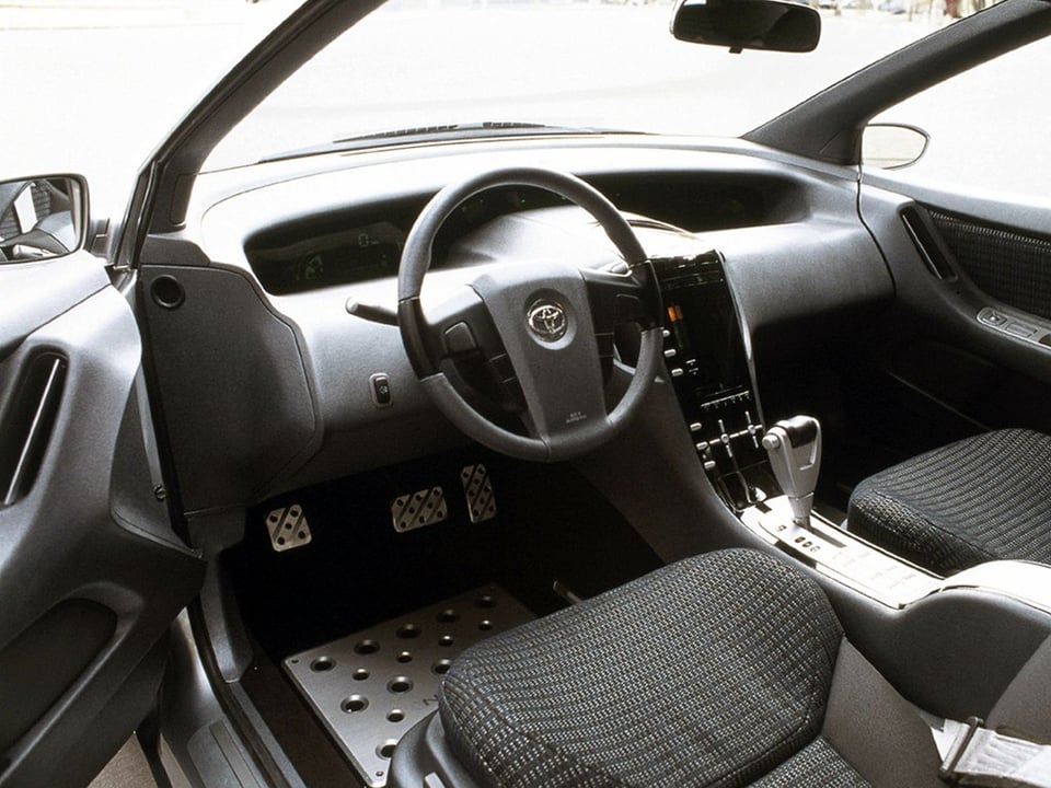 The cabin was similar to a second-generation Prius, featuring a shiny center stack and multiple screens, including monitors for both the driver and front passenger, along with a screen between the rear seats.