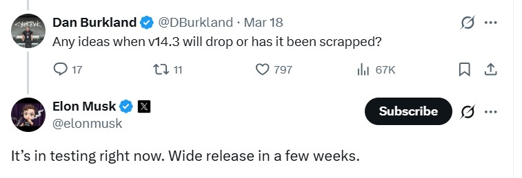 Screenshot from X.com saying Full Self Driving 14.3 is coming soon.