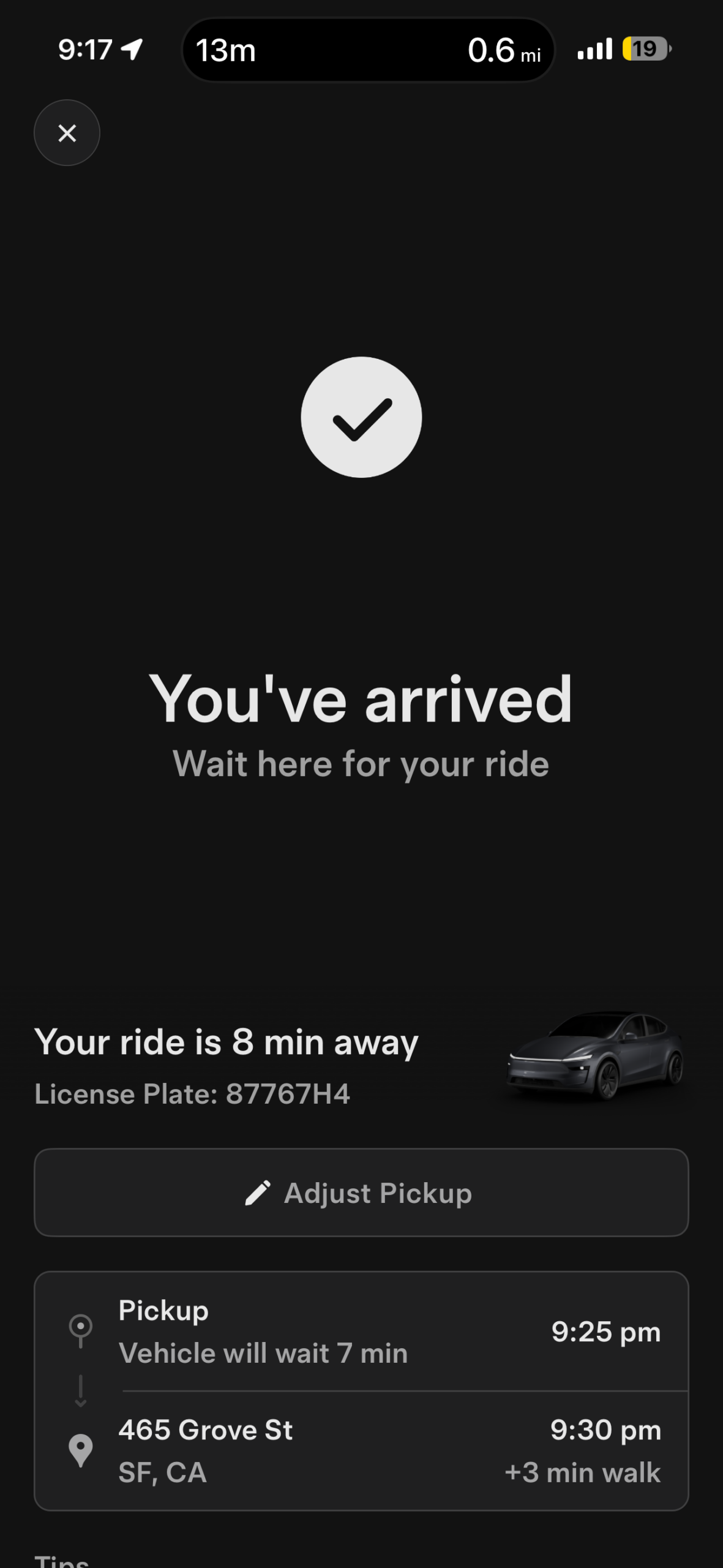 This is the screenshot from the app when you click the “Find Pickup” button to find the pickup spot. Sometimes it would say I’m at the pickup spot when the pickup was actually across the street. I have also had that happen with the other services, but with Uber and Lyft, you can ask the driver to come and get you, while with Tesla and Waymo, you have to get to the car.