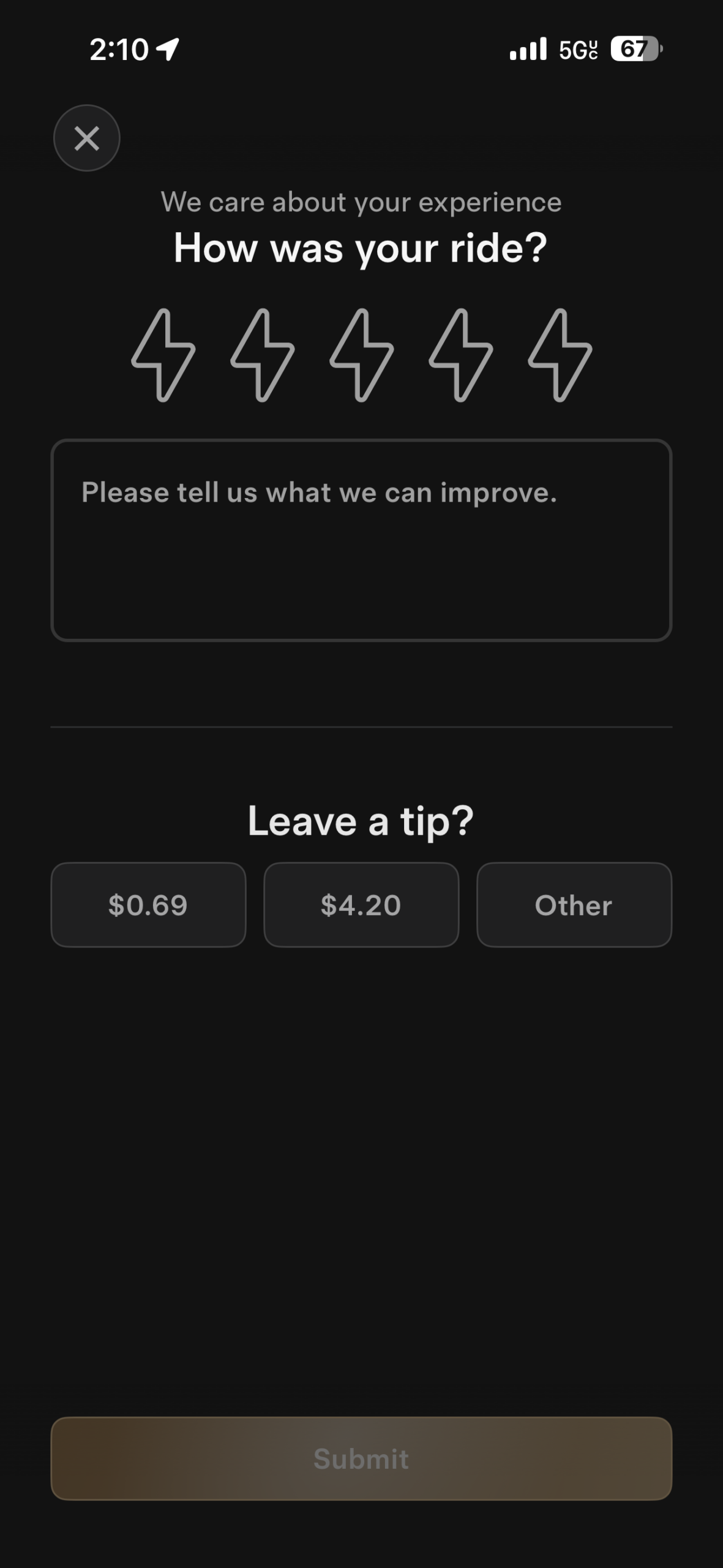 Tesla asks for a rating, comments, and a tip after every ride. But the tip is just a joke. If you try to leave one, you get the “just kidding” screen below.
