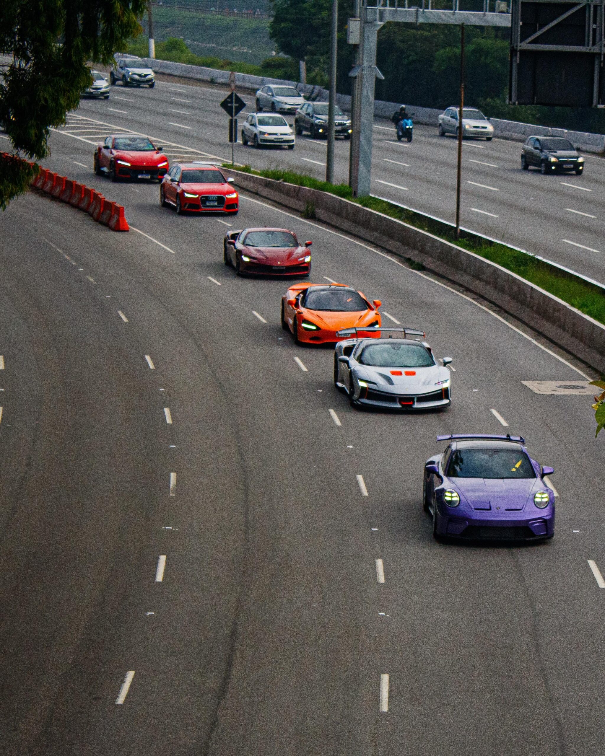 Look at this [multi] convoy I found — featuring [Ferrari SF90 XX], [McLaren 750S], [Ferrari Purosangue], [porsche gt3], and [Audi RS6].
