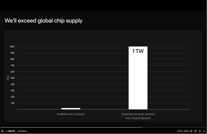 Given that 1 TW is equal to 1,000 GW, that means that the output of the entire semiconductor industry is only capable of producing 2% of what Musk’s companies alone need to scale.