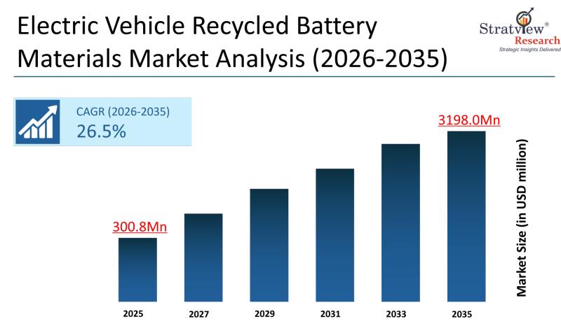 The electric vehicle recycled battery materials market focuses on recovering critical materials such as lithium, cobalt, nickel, copper, and aluminum from end-of-life EV batteries for reuse in new battery production. According to Stratview Research, the market reached US$ 300.8 million in 2025 and is projected to grow at a CAGR of 26.3% during 2020-2025, driven primarily by the rapid expansion of electric vehicle adoption, which is generating a growing volume of spent batteries requiring recycling to ensure raw material security. Stratview further indicates that the annual demand is expected to reach US$ 385.6 million in 2026 and is projected to grow at a CAGR of 26.5% during 2026-2035 to reach US$ 3,198.0 million by 2035, reflecting strong long-term demand for recycled battery materials.