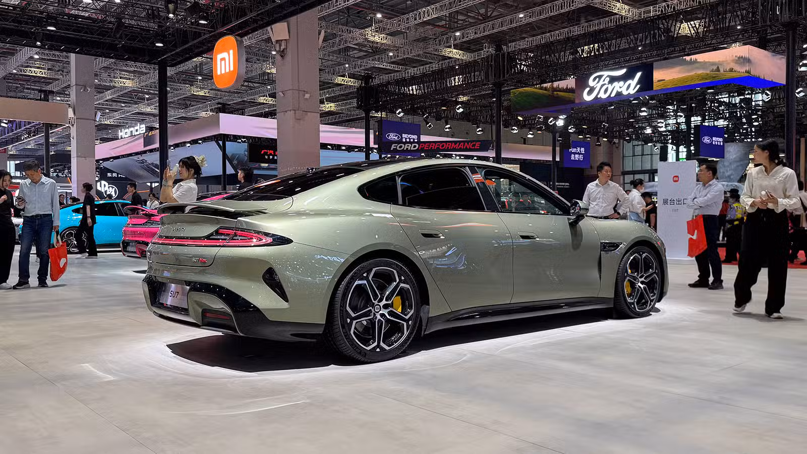 (A Xiaomi SU7 on display at the Shanghai Auto Show in April 2025. Image credit: CnEVPost)