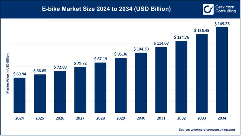 According to industry analysis, the e-bike market size was valued at approximately USD 60.94 billion in 2024 and is projected to reach nearly USD 149.23 billion by 2034, growing at a compound annual growth rate (CAGR) of 9.36% from 2025 to 2034. Rising fuel prices, increasing environmental awareness, urban traffic congestion, and supportive government policies promoting clean mobility are key factors supporting e-bike market growth.