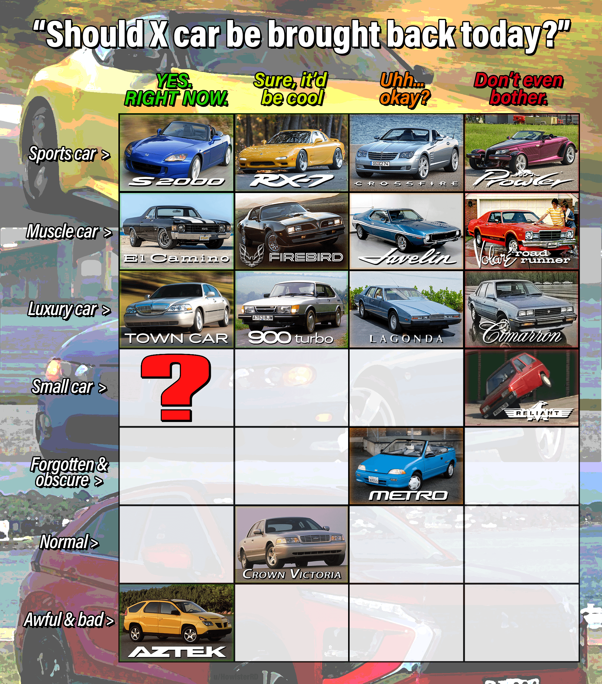 - Just be realistic and make sure the car actually fits within the given category.