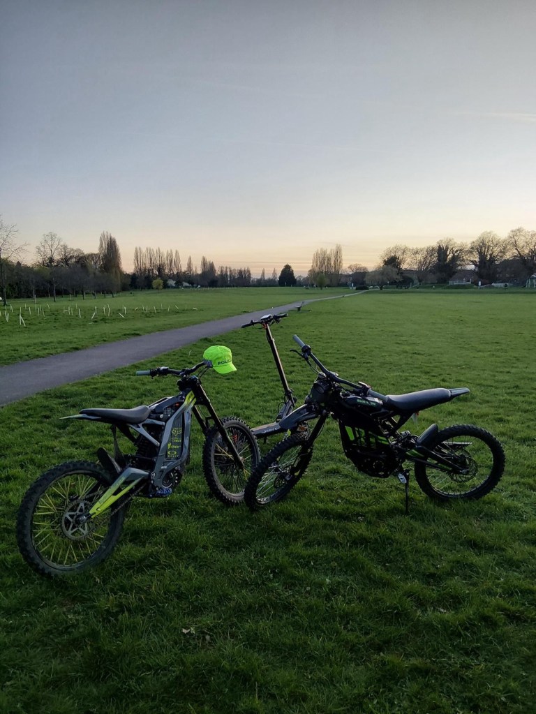 Officers were tipped off by members of the public that youths with face coverings on were taking the scenic route on footpaths on a large E-scooter and two twist throttle motorcycles at speed in Long Grove Park. The park was being enjoyed by many children and dog-walkers.
