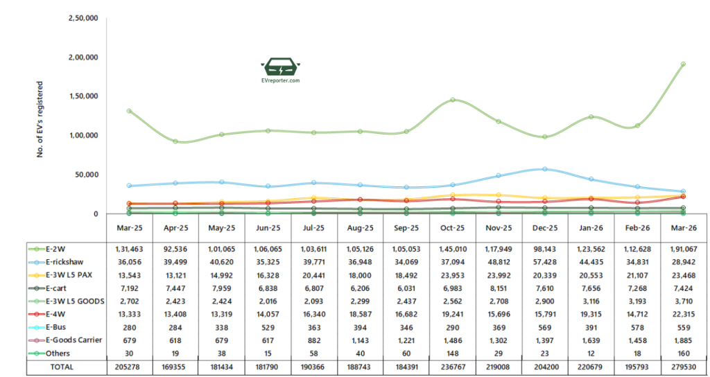 Total Registered Electric Vehicle Sales – Mar’26 – 2,79,530 I Feb’26 – 1,95,793