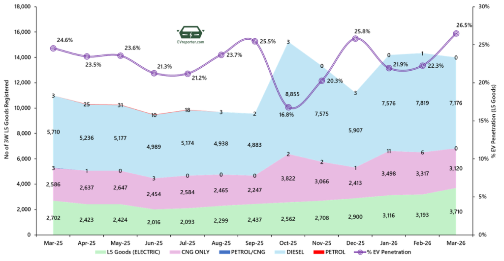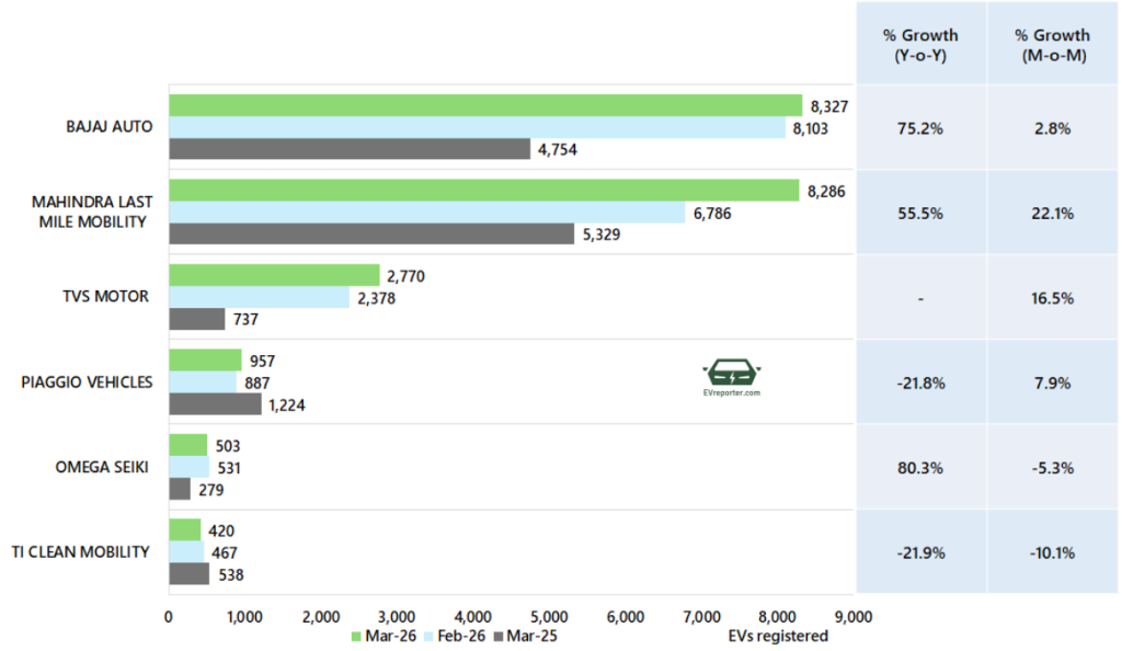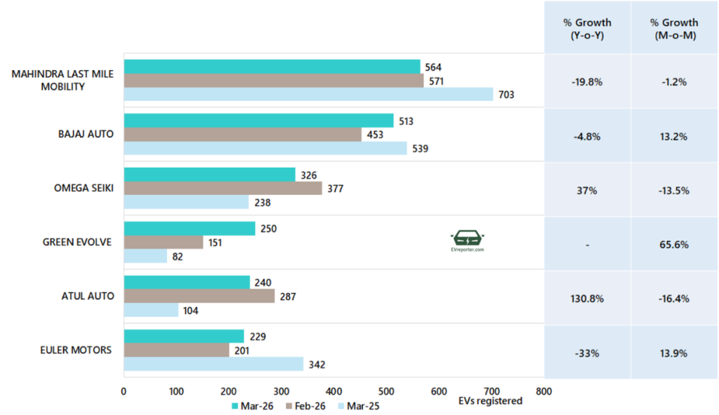 In March 2026, the electric three wheeler goods sales were led by Mahindra Last Mile Mobility, Bajaj Auto, and Omega Seiki.