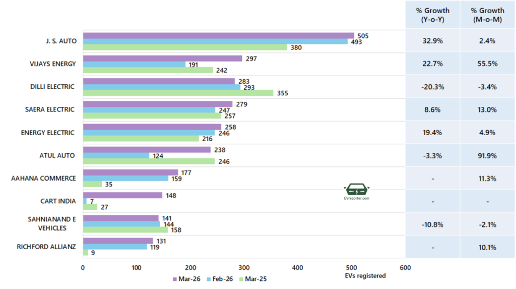 In March 2026, the e-cart sales were led by J.S. Auto and Vijays Energy.