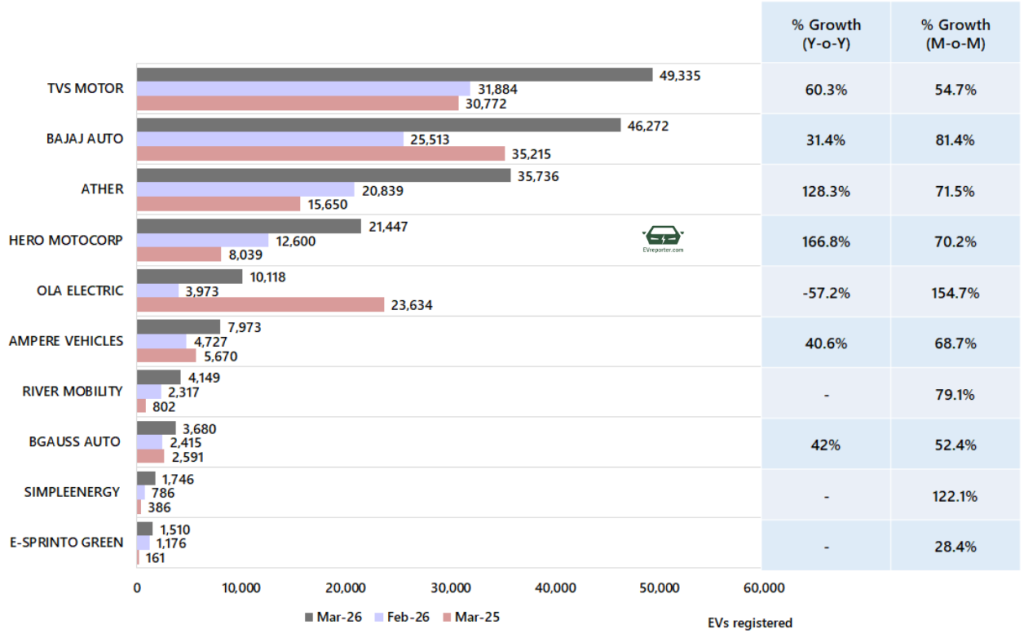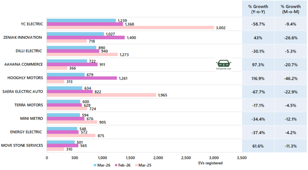In March 2026, the e-rickshaw sales were led by YC Electric, Zeniak Innovation, and Dilli Electric.
