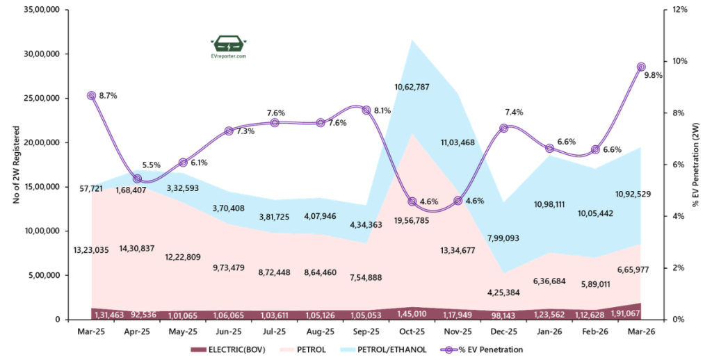 EV penetration in the two-wheeler (2W) category increased from 6.6% in February 2026 to 9.8% in March 2026.