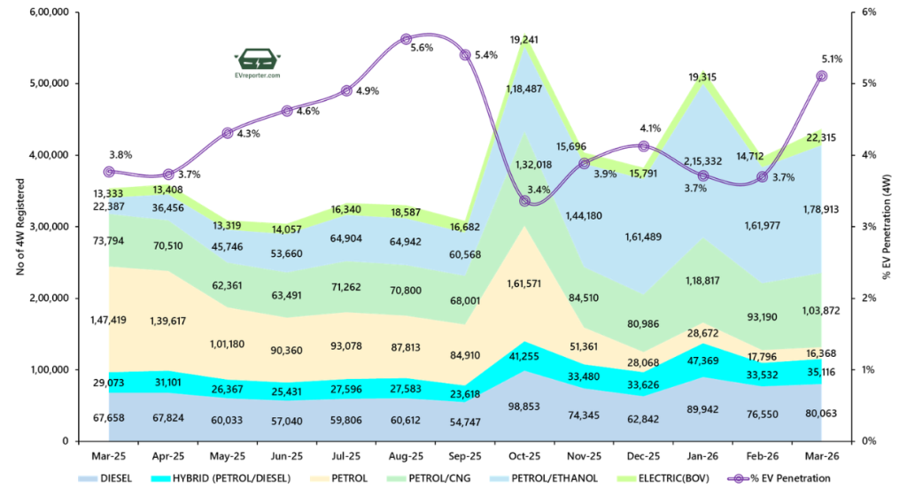 The penetration of electric vehicles (EVs) in the four-wheeler passenger car/cab category rose from 3.7% in February 2026 to 5.1% in March 2026.