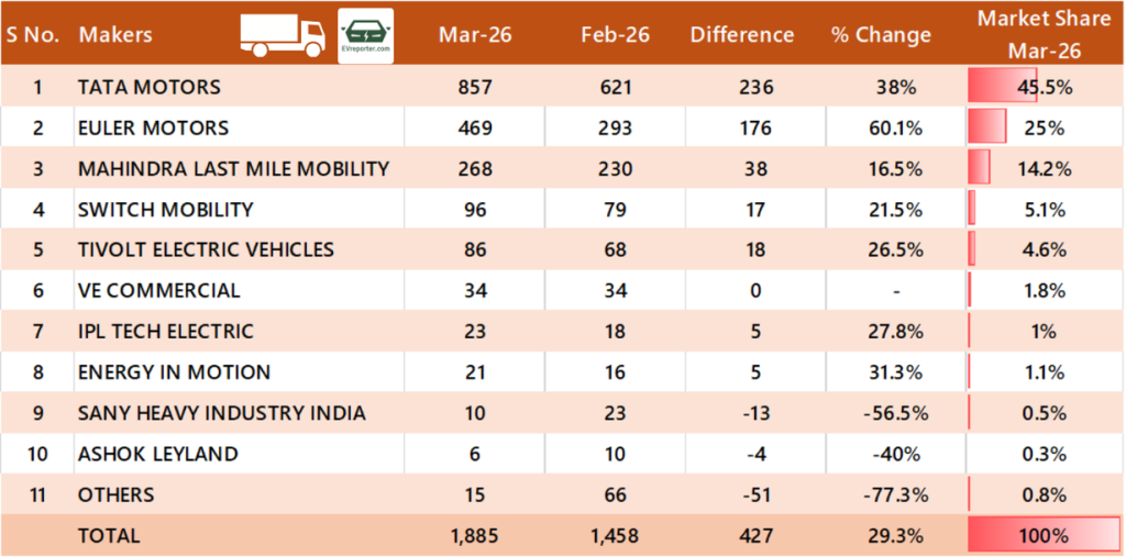 Tata Motors is the clear leader with over 45% market share in e-goods carrier sales in March 2026, followed by Euler Motors and Mahindra Last Mile Mobility.