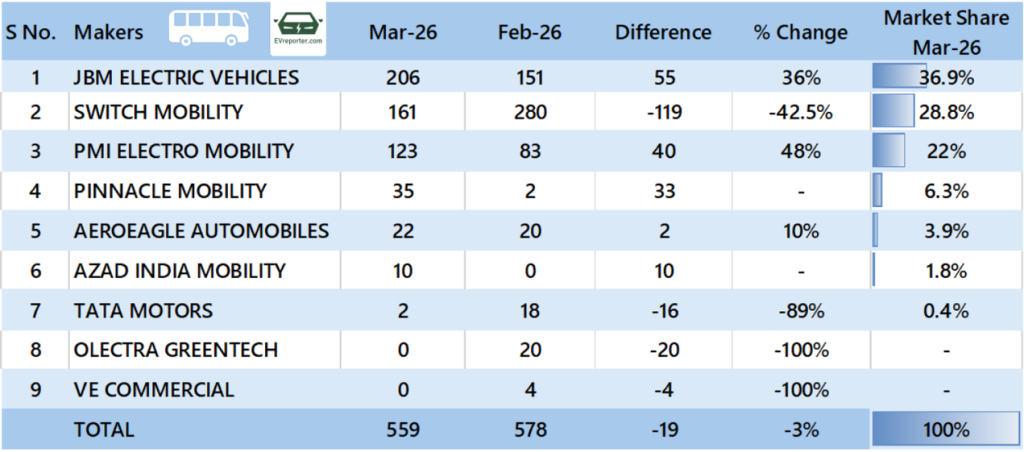 JBM Electric Vehicles sold the most electric buses in March 2026, followed by Switch Mobility and PMI Electro Mobility.
