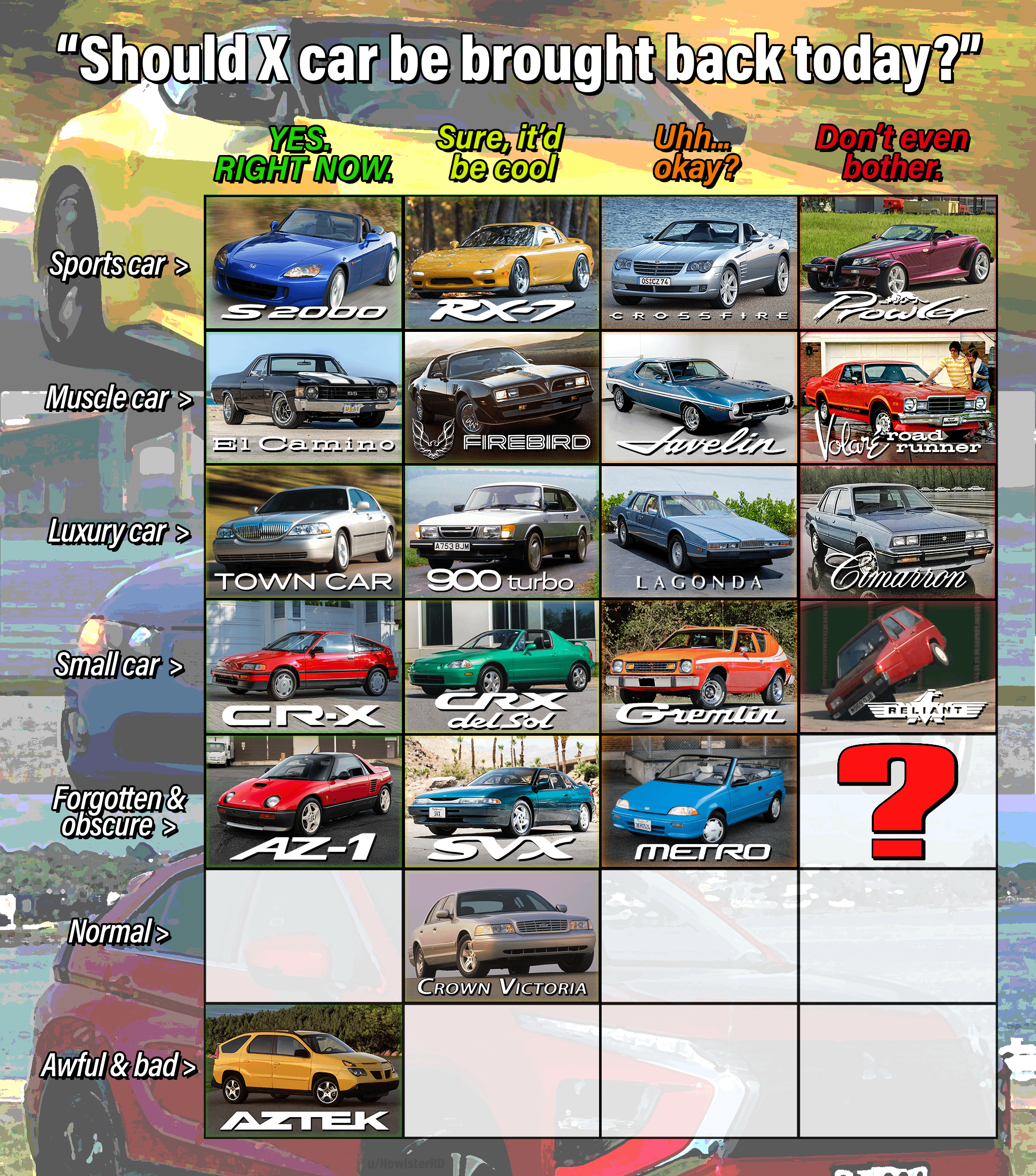 5. Special editions of dead cars (i.e. Buick GNX, Dodge Charger Daytona) can be suggested but they follow the timeline of the main car model they’re based on.