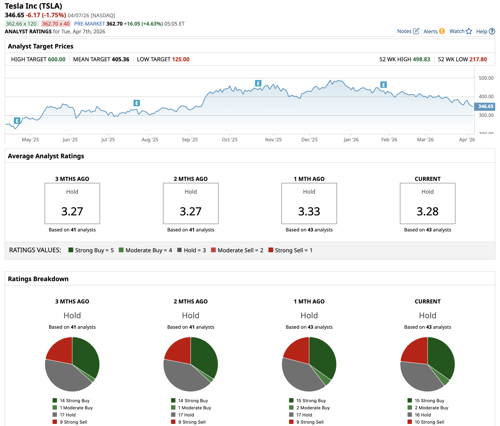 Out of the 43 analysts covering TSLA stock, 15 recommend “Strong Buy,” two recommend “Moderate Buy,” 16 recommend “Hold,” and 10 recommend “Strong Sell.” The average TSLA price target is $405.36, above the current price of about $347.