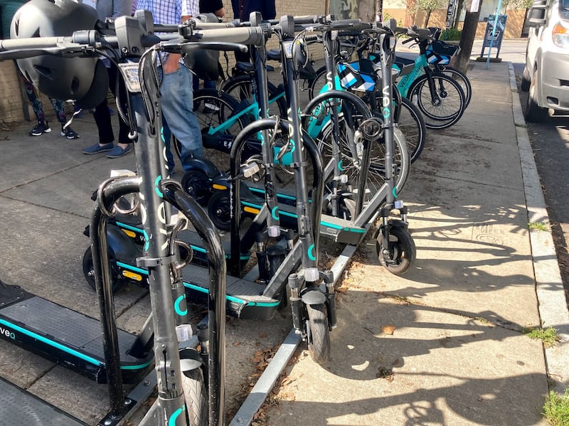 Syracuse Sync New Veo scooters and bikes are lined up and ready to rent at a station near Westcott Street and Harvard Place. Photo courtesy of city of Syracuse. (Courtesy)