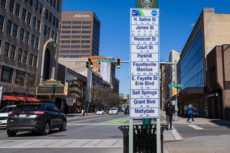 Alternative Transportation A Centro bus stop on Wednesday, April 8, 2026, in downtown Syracuse, N.Y. (Chloe Trofatter | ctrofatter@syracuse.com) ((Chloe Trofatter | ctrofatter@syracuse.com)/(Chloe Trofatter | ctrofatter@syracuse.com))