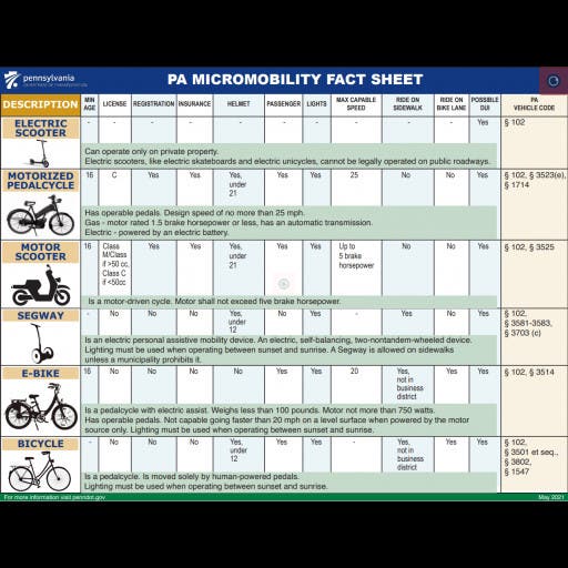Below is a fact sheet shared by Lower Moreland Police regarding various types of bikes and what laws apply: