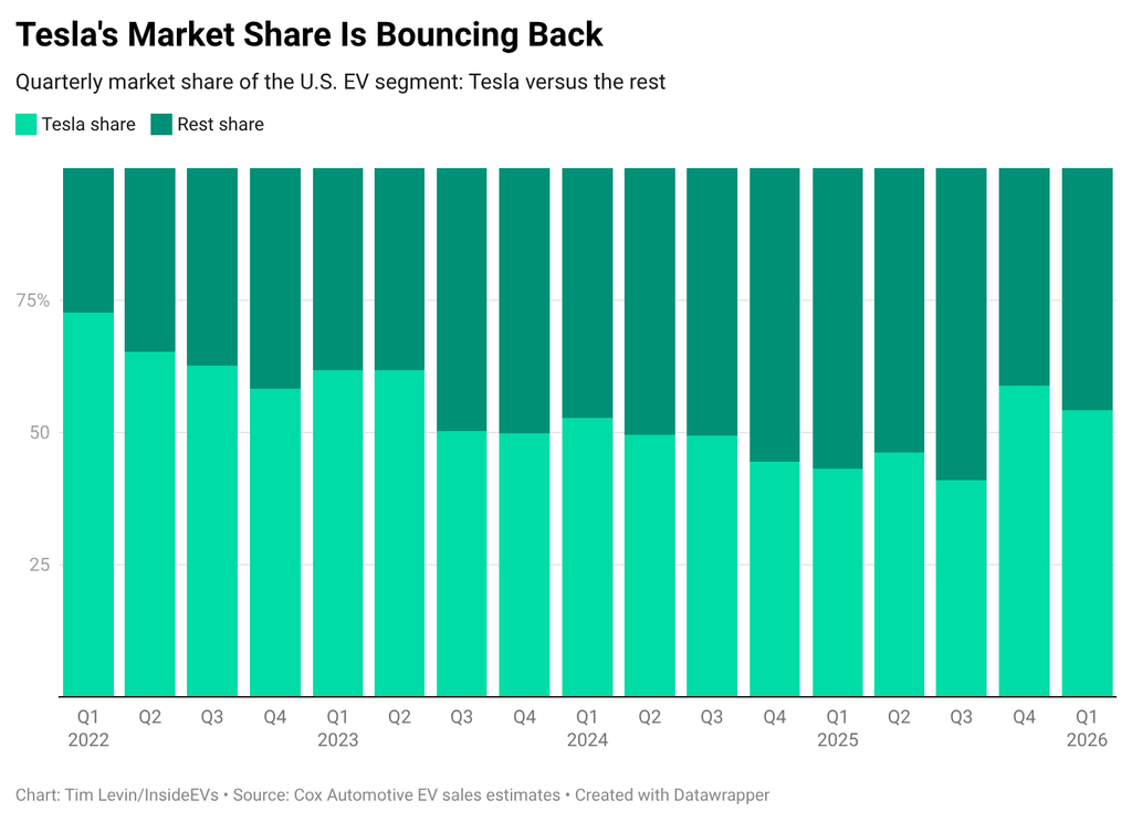 While a rush to claim the EV tax credit before it expired on September 30 created a boom-and-bust cycle for the entire car industry, Tesla’s sales weren’t nearly as volatile. From Q3 to Q4 of 2025, non-Tesla EV sales in the U.S. cratered by some 63%. Tesla sales dropped too, but only by 23%, boosting its slice of the EV market to over half for the first time since early 2024.